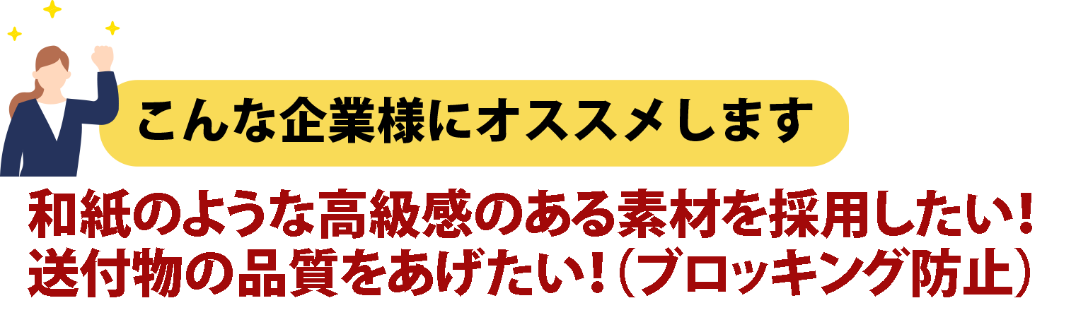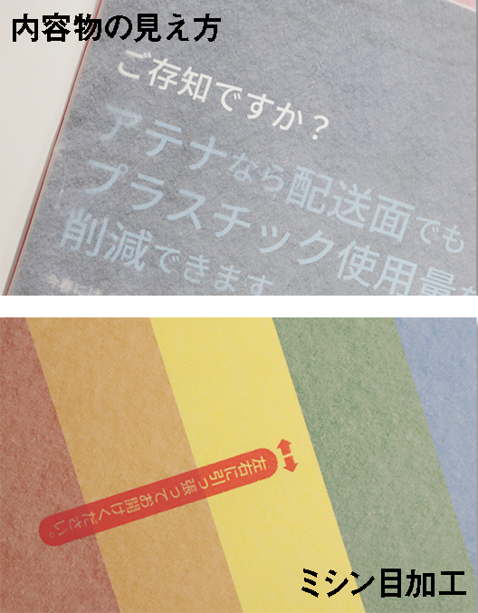 グラビア印刷や水性フレキソ印刷が可能で、ビニールよりも静電気が発生しにくいため、封筒同士のくっつきや剥がれを防ぐブロッキング効果もあります。さらに、ミシン目加工にも対応しています。