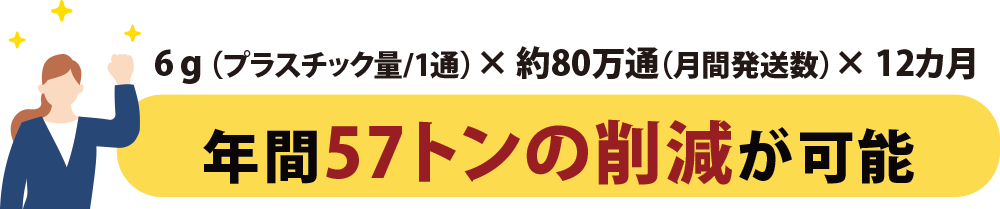 お客様へ月間80万通のダイレクトメールを発送したと想定します。そのラッピングを従来のポリエチレンフィルムからペーパーフィルムに替えて、そのプラスチック量を算出すると……