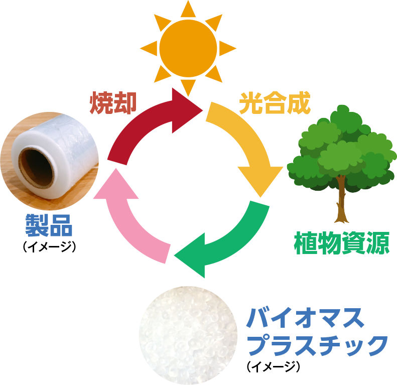 バイオマス資源を一部使用したプラスチック素材は、従来のフィルムに比べてCO2の増加量を抑えることができます。