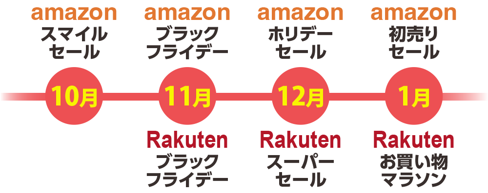年末にかけての主要なセールイベントとして「Amazonブラックフライデー」「楽天スーパーセール」「超ペイペイ祭」 などが11月からスタートし、年末にかけての期間に開催されます。