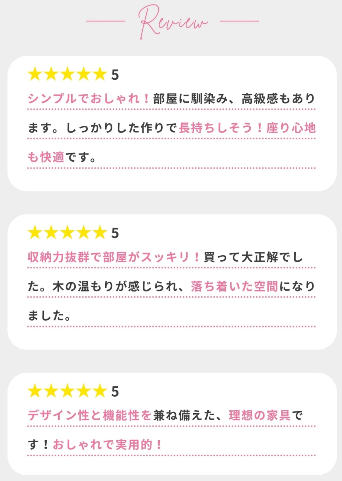 レビューをただ並べるのではなく、「使い心地」「耐久性」「コスパ」などテーマ別に再整理することで、情報が格段に読みやすくなります。ユーザーは求めている評価を瞬時に確認でき、商品への信頼性も可視化されます。結果として、購入の後押しにつながる重要な改善ポイントとなります。