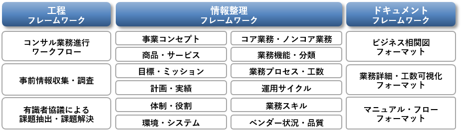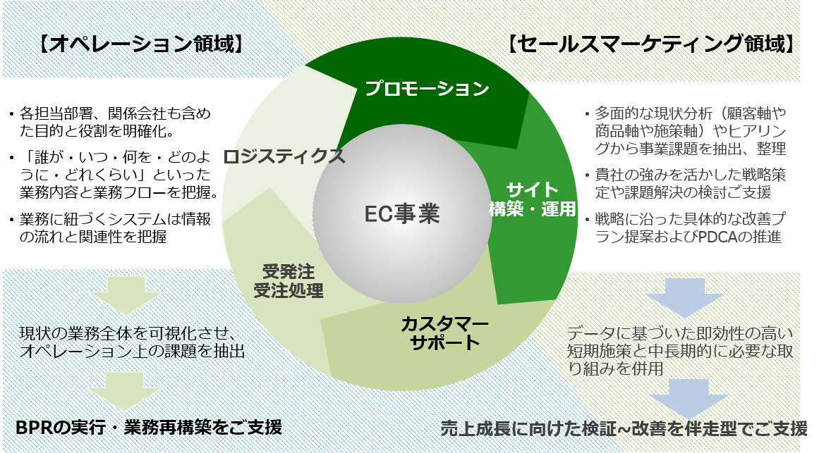 | 業務概要 | 体制、業務、システム相関など、EC事業におけるすべてを可視化。課題を洗い出し、「あるべき姿」実現のための改善提案を実施。 |